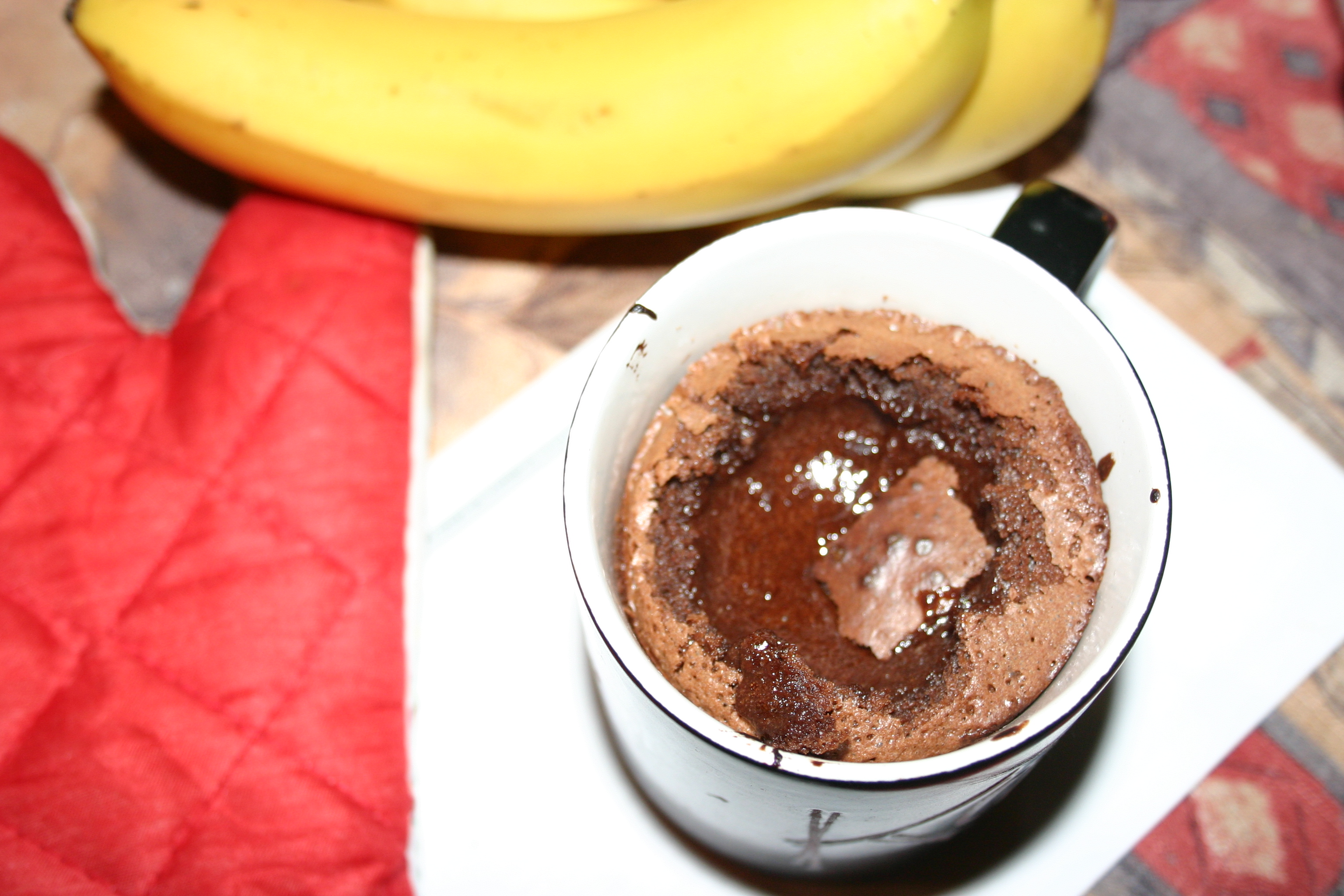 Сега обратно към готвенето. Добавете към добре разбърканата смес половин чаша пълнозърнесто брашно, една супена лъжица какао и щипка сол. Включете фурната на 220 градуса и изчакайте, докато се загрее равномерно. Напълнете три или четири порцеланови чаши, които предварително сте връчили на съквартирантката си, за да намасли стените им, със сместа. Добре, две. Ок, щом толкова искате огромни суфлета като нашите. Сложете ги във фурната и си сложете аларма за след 10 минути. НЕ ОТВАРЯЙТЕ ФУРНАТА, ДОКАТО СЕ ПЕКАТ. Съжалявам за CapsLock-а, ама ще ви спаднат суфлетата и после ще обвините мен, че съм ви заблудила. Ако печете кексчетата в по-малки чаши или във формички за крем карамел (те са най-подходящи), и 8 минути могат да са достатъчни. Гледайте ги през стъклото – трябва да се понадуят. От момента, в който са започнали да се гордеят със себе си и да дебелеят, до ваденето им не трябва да има повече от 2-3 минути. Нашите дебелаци се пекоха цели 13 минути, защото бяха гигантски. Без майтап. На това на Теди до такава степен му порасна работата, че се опита да изскочи от чашата си.