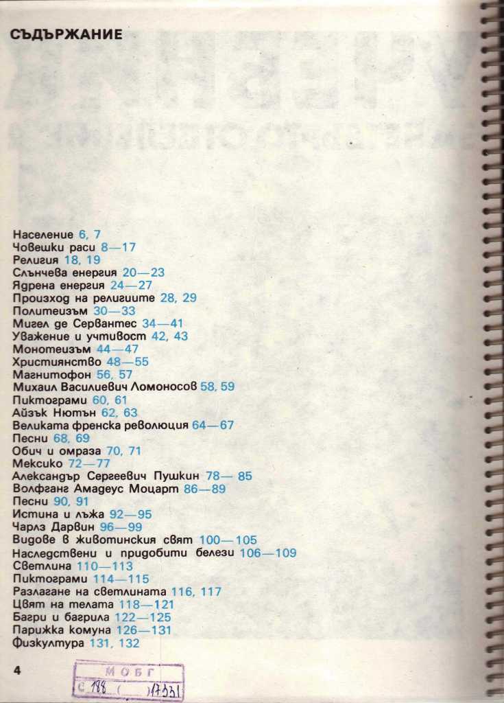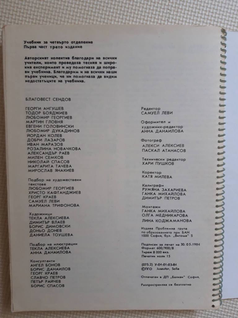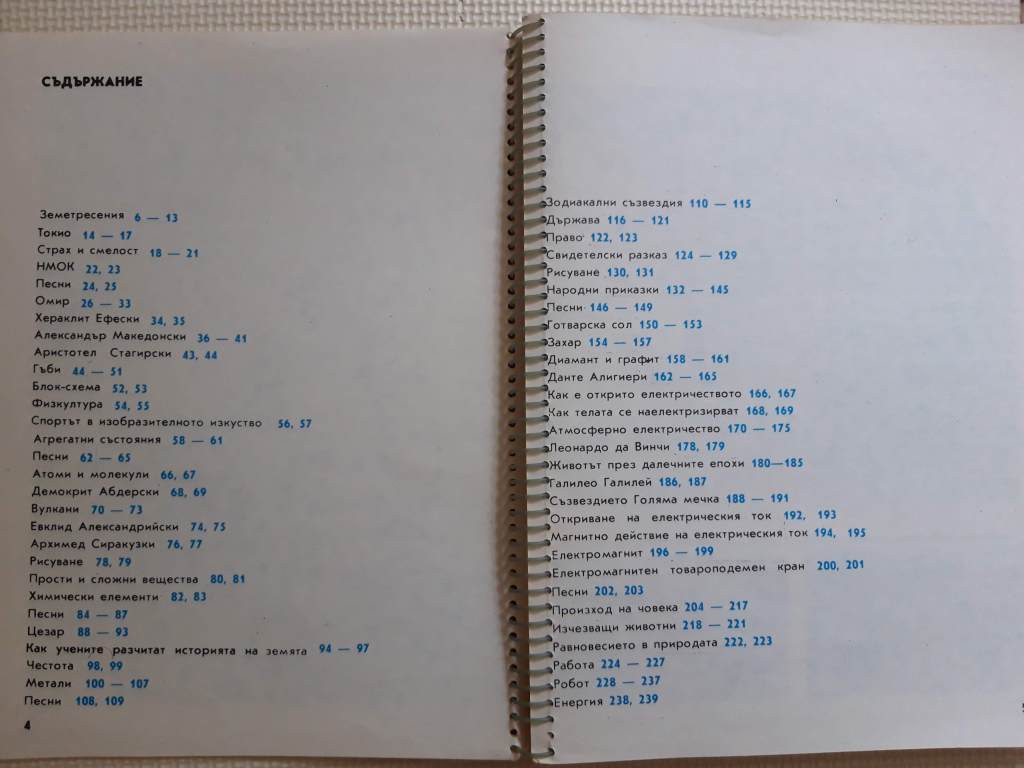Нарочно съм ви снимала съдържанието – в този удивителен учебник имаше обяснение на явлението земетресение, снимки от Япония, информация за Токио, определение за най-голям общ делител и откъс от „По телеграфа“ на Хемингуей буквално в рамките на четири страници. Т.е. това със сигурност не беше учебник по нещо конкретно – освен ако въпросното нещо не беше „всичкознание“. Така викахме на тетрадките си, когато в последните класове на гимназията използвахме една по всички предмети, но до онзи момент не подозирах, че съществуват и такива учебници. Оказа се, че тази тежка книжка, която ме очарова толкова много, е една от многото, по които са се обучавали ученици от експерименталната група на Благовест Сендов.