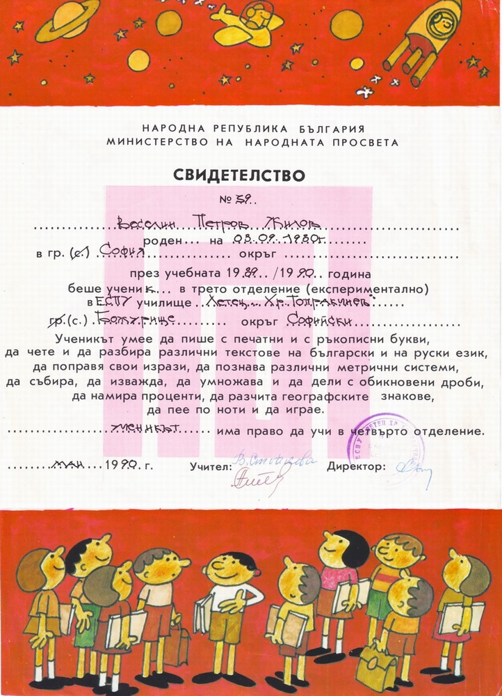 Един ден в детската градина (много добре си го спомням) дойдоха две учителки – другарките Рангелова и Иванова от 34-то ЕСПУ „Адалберт Антонов Малчика“ (тогава). Записваха доброволно (това ще го подчертая – доброволно) деца, които искат да учат по нова система, в която още от 6 години се тръгва на училище. Тогава ние, децата, нищо неразбиращи, се записахме почти всичките. Поставихме родителите си малко пред свършен факт, но у всички нас имаше много ентусиазъм, защото всичките приятели ще бъдем пак заедно. Дойде 15-ти септември 1980 и колелото се завъртя. Наричаха ни „експериментален клас“. Спяхме на обяд, доколкото „обичахме“ да спим на обяд. Голяма борба падаше с учителките, докато ни умирят, но в крайна сметка спяхме от 14:00 до 16:00 часа. И винаги ни будеха с хубава детска песничка от грамофона. Имахме и следобедна закуска. Чантите ни стояха отстрани на чина на специална стойка и не сме ги носили до къщи. Учебниците още с кориците си те грабват, защото Доньо Донев ги беше изрисувал с различни сценки от „Тримата глупаци“. Когато ги отвориш, виждаш следното: на лявата страница в горната половина имаше интересен урок за четене на всякакви теми – за годишните сезони и как чрез юмручетата си да определяме кой месец колко дни има, научавахме за реактивния двигател на самолетите, че приличал на бутилка, обърната с гърлото назад, научавахме още какво представлява телефонната система – два телефона и централа и всевъзможна друга интересна информация. Уроците на руски език пък бяха на розов фон. Долната половина на лявата страница ни учеше как да смятаме – събиране, изваждане, умножение, деление. Или още какво представлява двоичната система и как на числата от 0 до 15 лесно можем да определим двоичния код чрез дървовидна структура и въпроси – числото по-голямо ли е от 7 – да, не, числото по-голямо ли е от 3 – да, не, и така като подредиш за всяко не – 0, и за всяко да – 1, и се получаваше двоичния код на числото. Така под формата на игра се създаваха начални познания по информатика. Имахме уроци за чуждите азбуки – английската, немската, френската и руската. Дясната страница беше разделена вертикално на две колони – в лявата имаше откъс от детска книга или разказ за следобяд, както и малка и лесна кръстословица, свързана с конкретния урок, или картинка за оцветяване, или плетеница от думи, която само когато силно наклониш учебника можеш да прочетеш ясно, или картинки с илюзорни изображения. В дясната колона имаше въпроси и задачи, отново свързани с конкретния урок, за затвърждаване на получените знания. Имаше и задачи по музика, с които учехме нотите и песнички. Винаги в сряда имахме трудово, при което от ъгловат макет на стая, разграфен на квадратчета от по 10 мм, мека тел и гланцови блокчета правехме мебели и всевъзможни фигури – това беше много добре за развиване на детската фантазия. Учеха ни да пишем печатно. Въобще всичко беше насочено към техниката. Може би затова толкова много ми беше интересно и учудвах всичките ми роднини, че обичам да ходя на училище, докато другите деца вече го бяха намразили. На всички мои съученици тогава им харесваше, но за съжаление в трети клас се наложи втория срок да ни подготвят за нормалното обучение, тъй като щели да прекратяват експеримента. Тогава започнаха да ни учат да пишем ръкописно и стана голяма какафония. Аз и досега