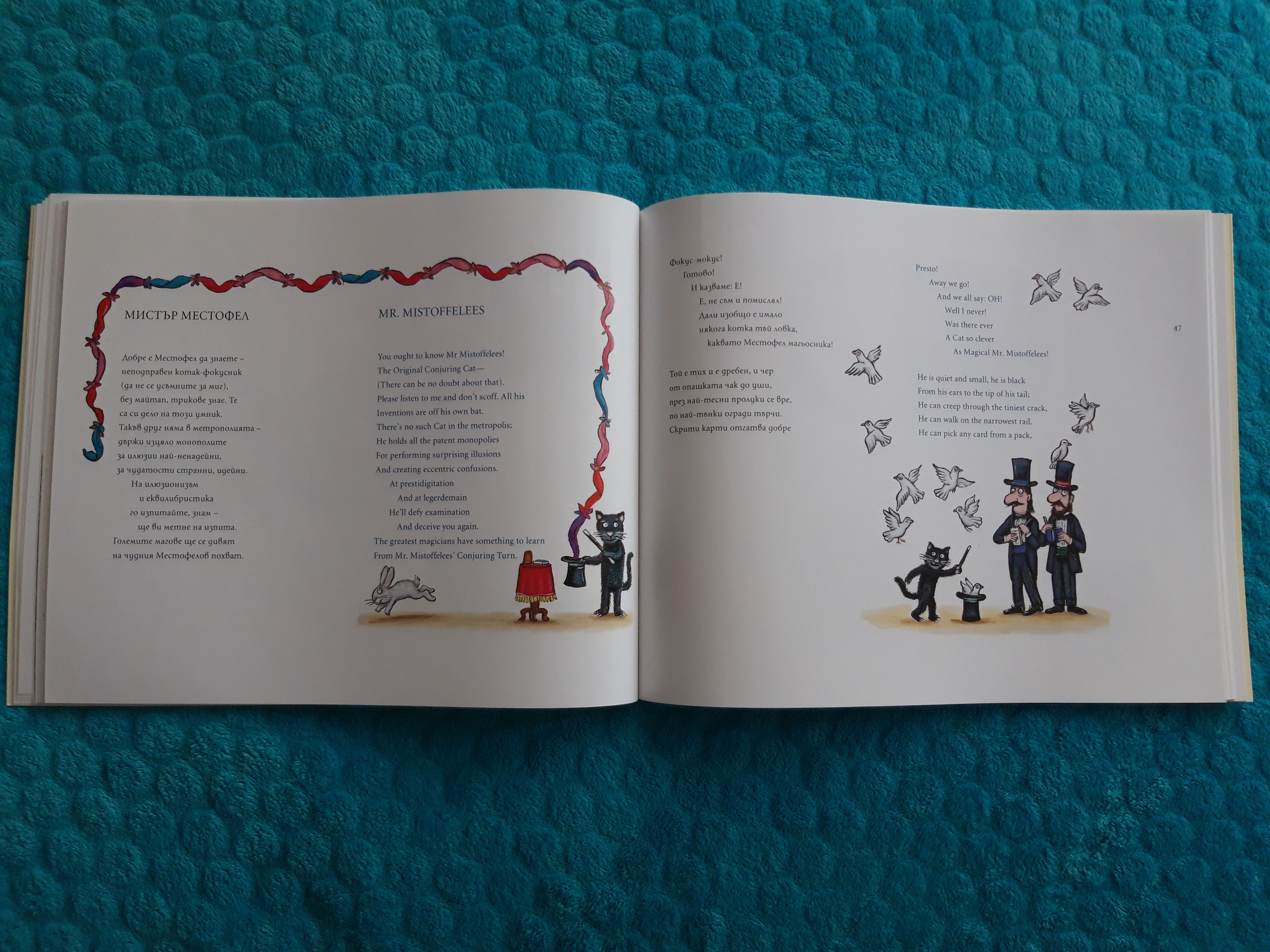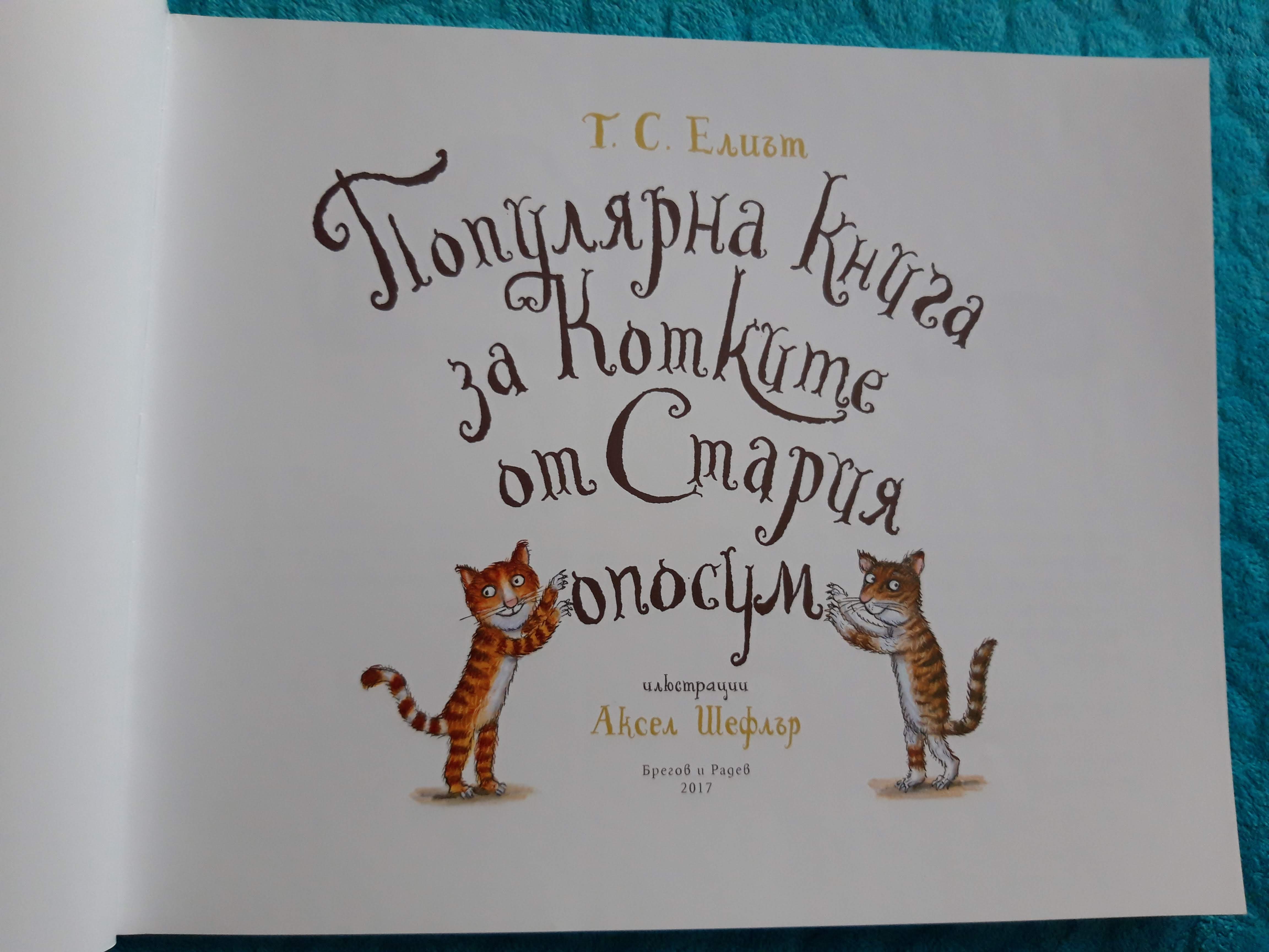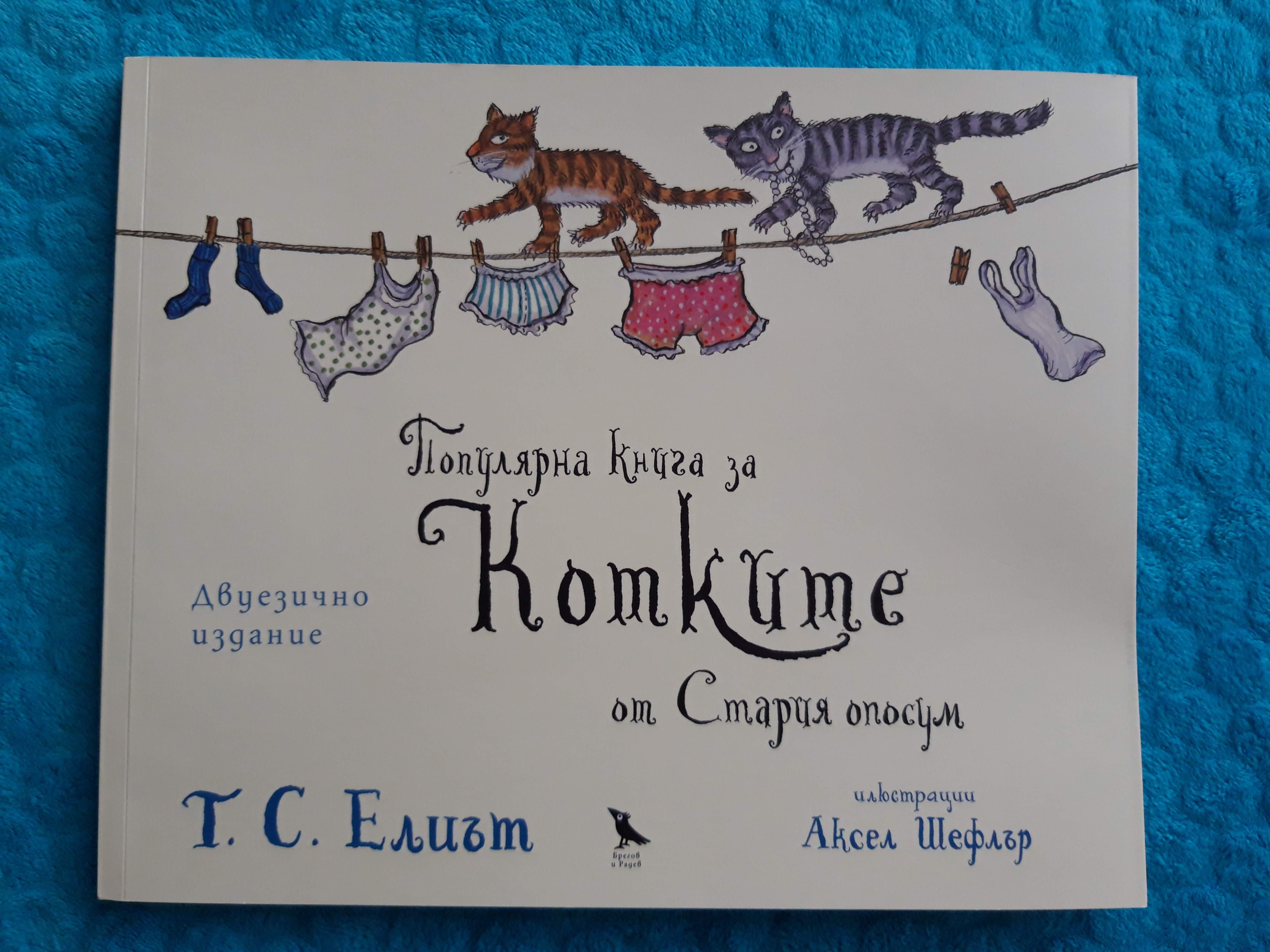Следващата книга, за която искам да ви разкажа, е великолепното издание на “Популярна книга за котките от Стария опосум” на Т.С. Елиът. Вече говорих за филма тук – покрай него открих книгата. Тя е двуезична – Брегов и Радев са направили първия български превод на поемите на Елиът (който е наистина добър, особено като се има предвид колко са особени те), но са включили и оригиналите, илюстрациите пък са на Аксел Шефлър. Заедно с книгата получавате цели пет книгоразделителя с илюстрации. Изданието е с меки корици (това е единственият минус за мен), шрифтът е чудесен, хартията – плътна, а удоволствието – пълно, ако комбинирате четенето с музиката.