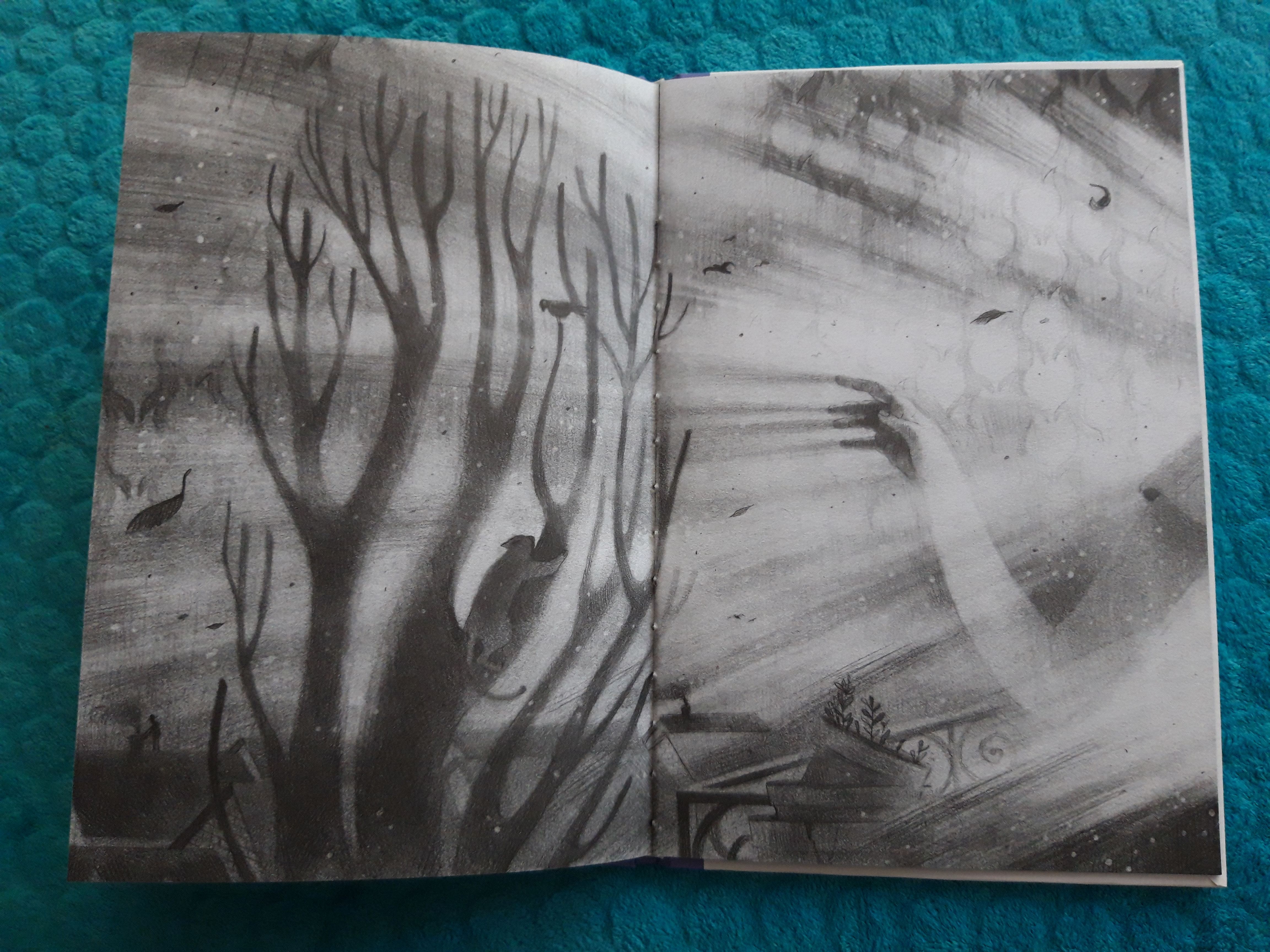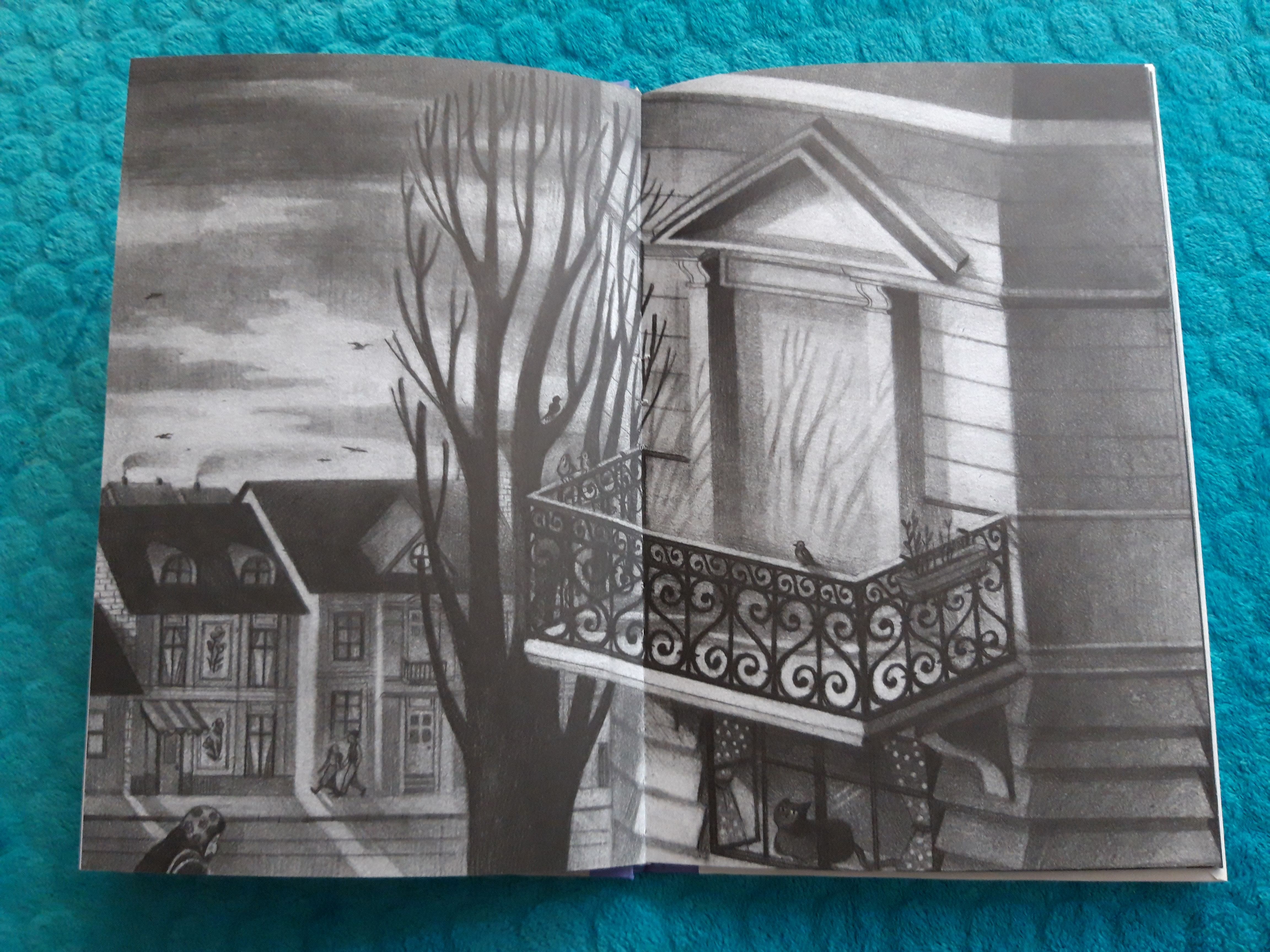 “Балконът” е още едно бижу, което разглеждам постоянно. Концепцията е много интересна – книгата е вдъхновена от стихотворението на Атанас Далчев “Балконът”, по което Зорница Христова пише сценарий, а Калина Мухова рисува илюстрациите. Всичките са графики – чак ми е странно, че ме грабнаха толкова много, защото по принцип това не е моят стил, винаги предпочитам цветни рисунки, но тези са наистина необикновени.