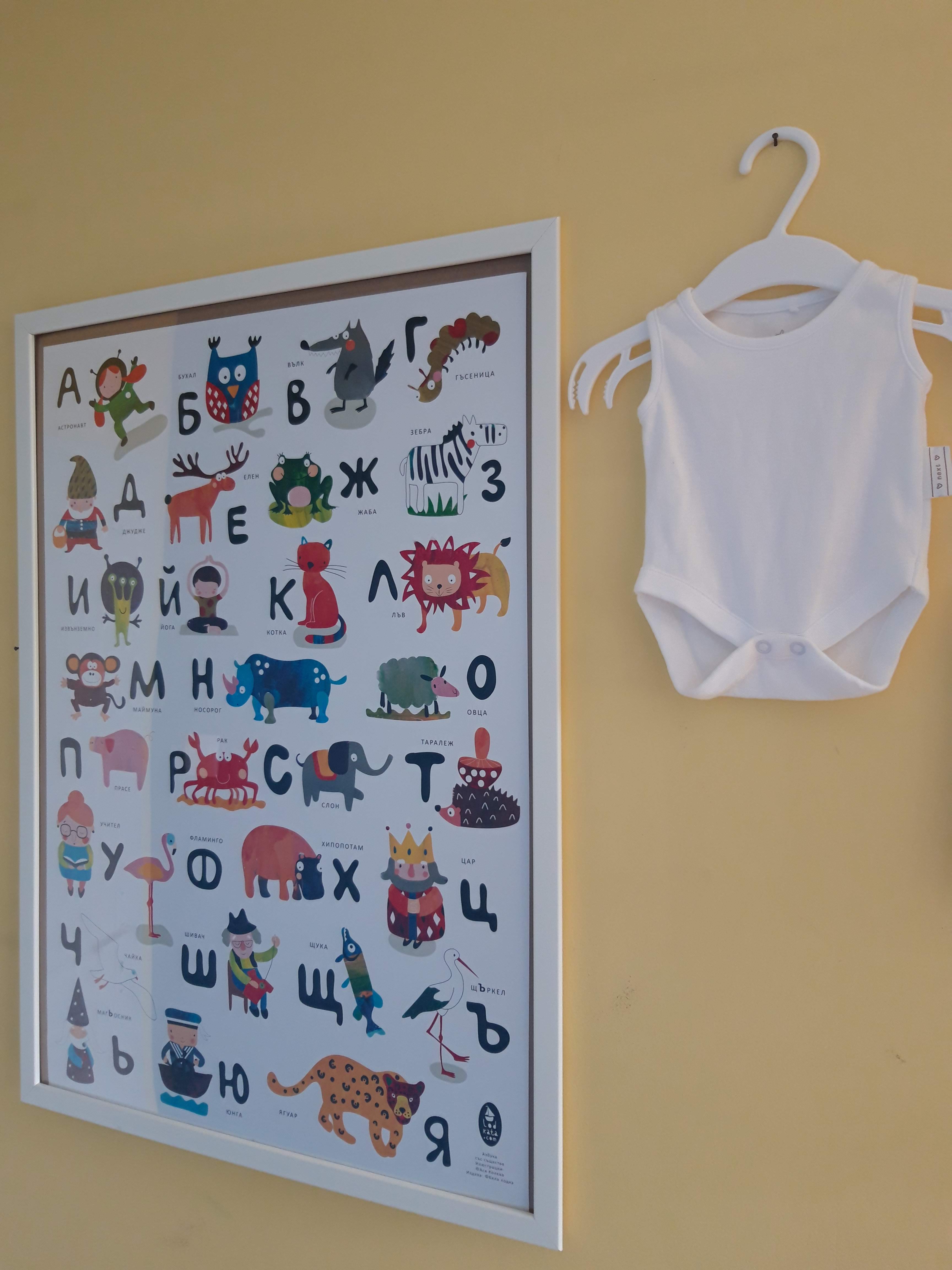 Плакатът с буквите, който виждате отгоре, е на Ася Колева – купихме го от Музейко много отдавна и го сложихме в тази рамка от Икеа. Съвсем нова придобивка пък ни е тази илюстрация, която Милена Трифонова нарисува специално за нас – да знаете, много е готино да подкрепите някой дизайнер, когото харесвате, като му възложите подобна задача. Много харесвам стила на Миленка и отдавна искам да притежавам нещо нейно, даже преди Калина да се роди обсъждахме дали да не нарисува направо стената в тогавашната ни спалня (добре, че се отказахме, иначе сега щяхме да сме зарязали илюстрацията там).
