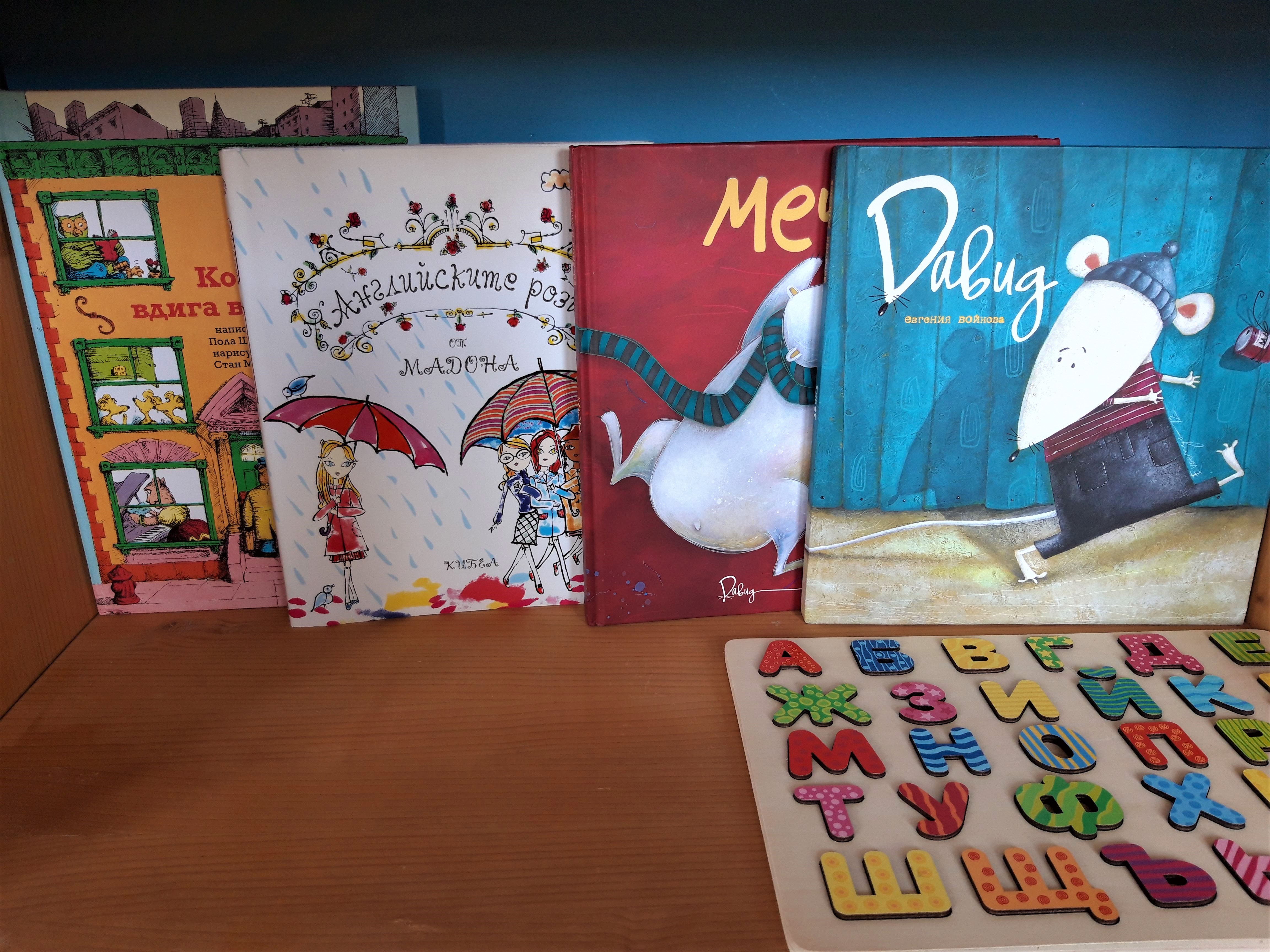 Вече не е тайна, че обожавам детски книжки, затова е съвсем естествено те да са основна декорация на детската стая вкъщи. Писала съм по-подробно за някои от любимите ни издания тук и тук, а ето как изглеждат подредени на етажерката (това определено е най-красивото място у нас):