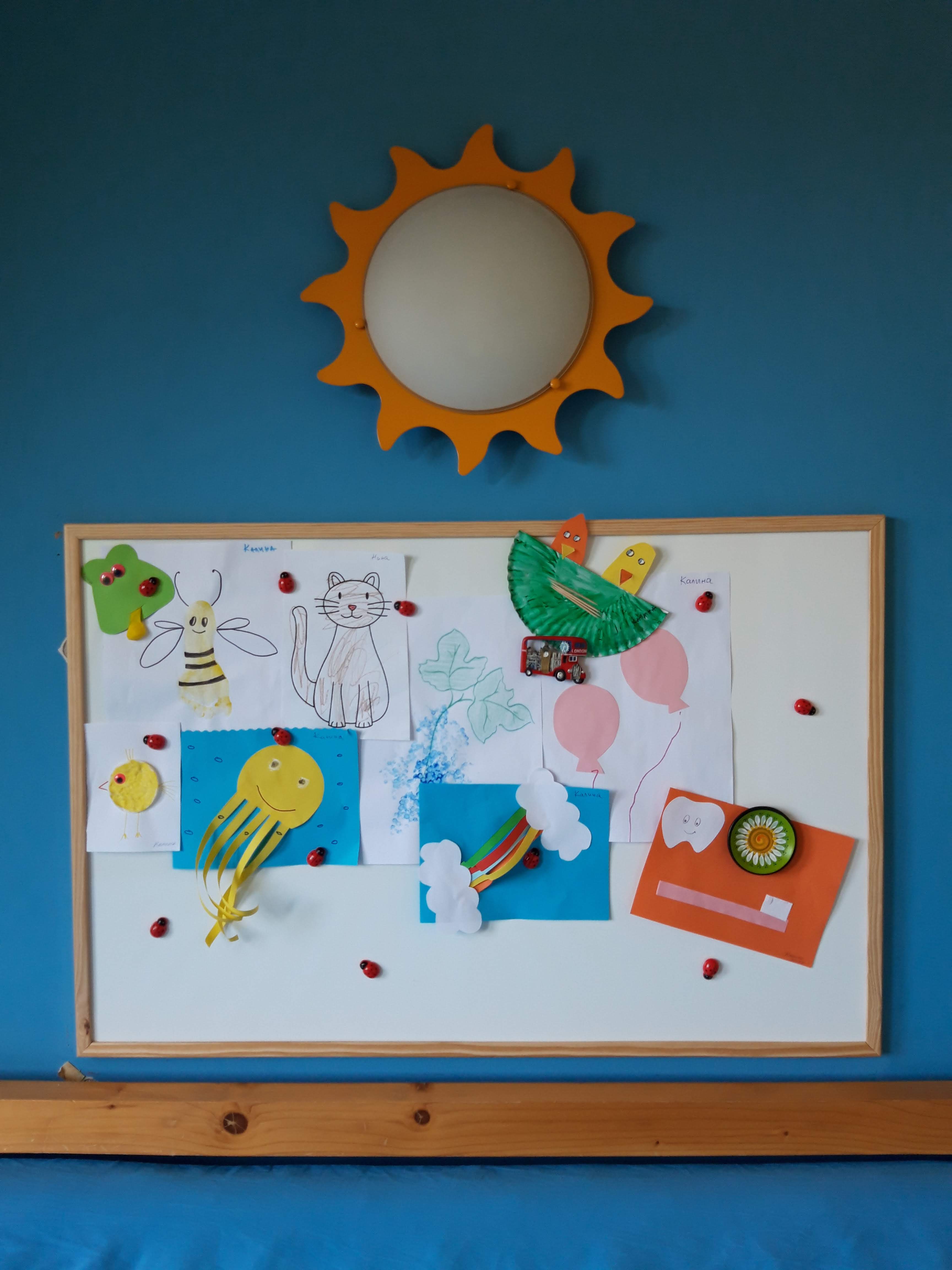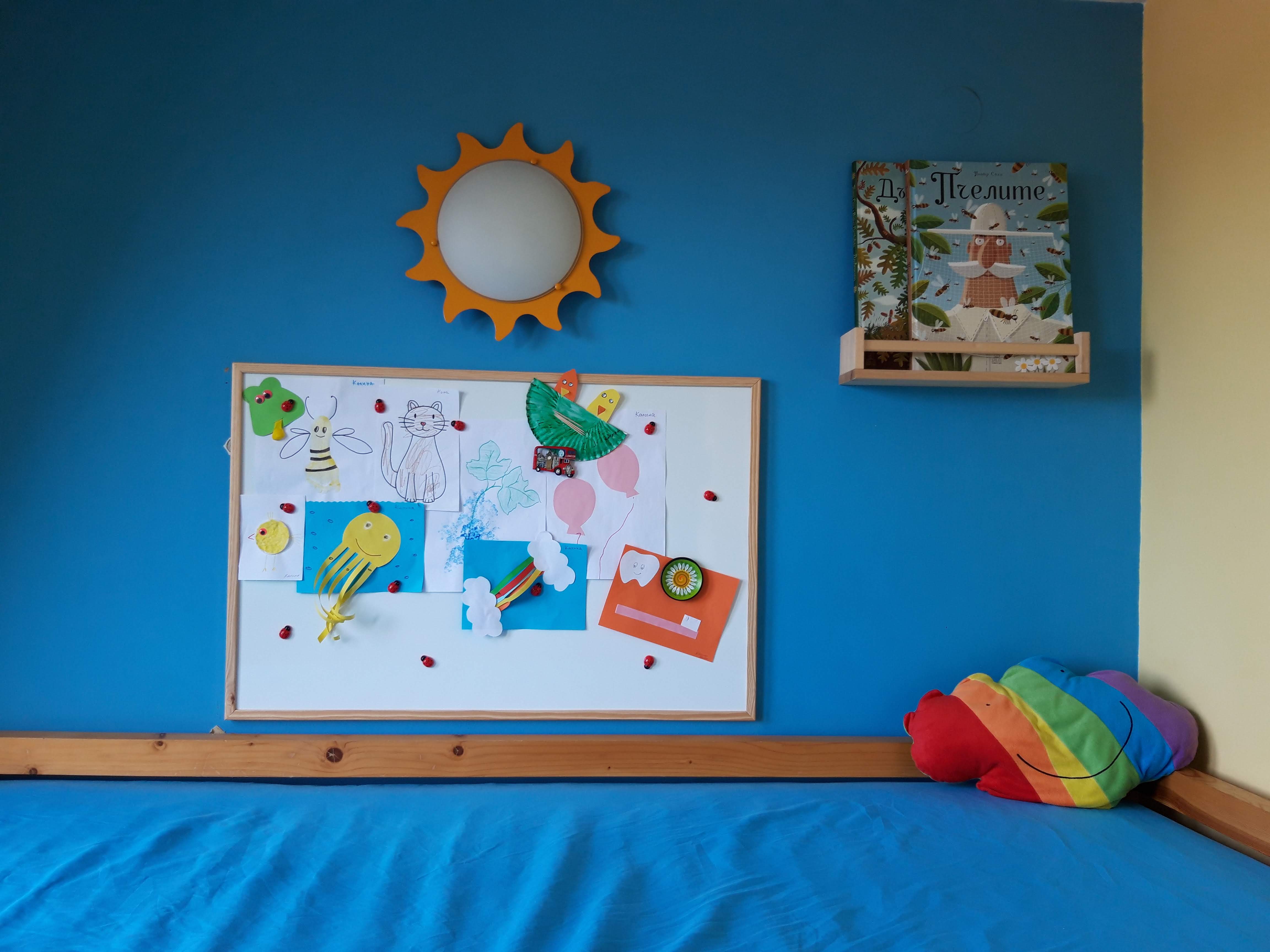 Прекарах ужасно много време в това да търся подходяща картина за това място (не намерих нищо достатъчно хубаво, което да си струва парите заради гигантския размер) и в крайна сметка ми хрумна да поръчам магнитна дъска, върху която да наредя рисунките на дъщеря ми от детската градина (до този момент се гъчкаха на хладилника). Дъска намерих на много разумна цена в онлайн книжарница Моливко – пристигна супер бързо и е чудесна, калинките също са от там! Мястото в момента изглежда така: